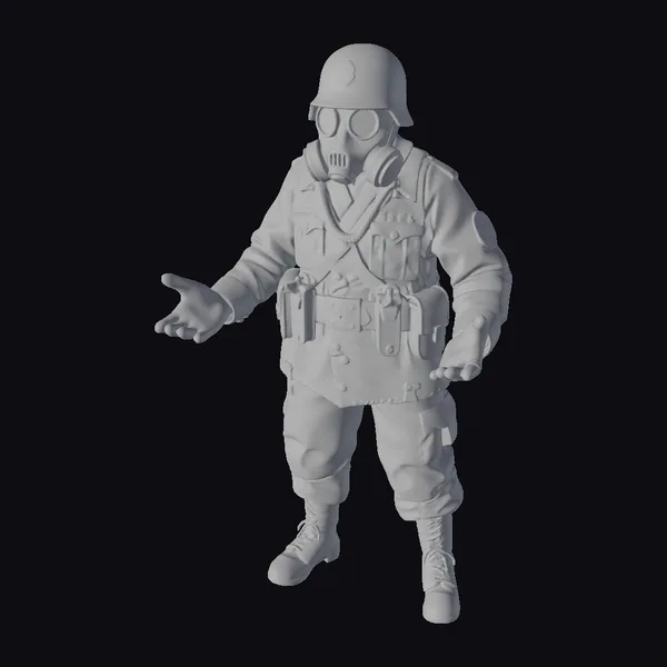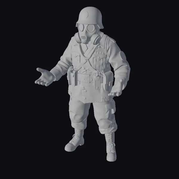 Standing tall with an air of menace, this detailed 3D model of a WW2 German infantry soldier dons a gas mask and stahlhelm, its rugged black uniform complemented by an assortment of utility belts and pouches. The armor plating on its shoulders and chest adds to its formidable appearance, while the glowing red eyes seem to burn with an inner fire. The soldier’s muscular physique and imposing stance evoke a sense of raw power, as if poised to charge into the fray at a moment’s notice. Its versatility makes it an ideal candidate for various applications, including games, 3D printing, VR/AR experiences, animation, and design projects.