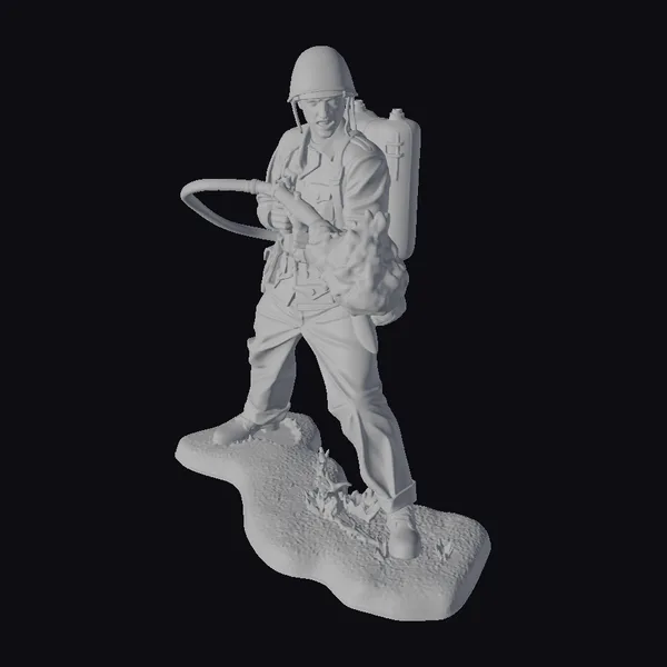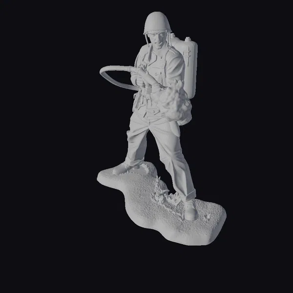 Rendered in meticulous detail, the soldier’s rugged green uniform and helmet exude a sense of battle-readiness. The flamethrower, with its distinctive black hose and nozzle spewing vibrant yellow flames, takes center stage. A green backpack adds to the soldier’s combat gear. Standing on a textured patch of ground with sparse vegetation, the model’s dynamic pose and realistic textures evoke a visceral response. Ideal for historical reenactments, educational projects, or immersive gaming environments, this model brings a piece of history to life.