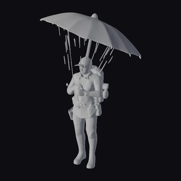 Rendered in exquisite detail, the paratrooper’s khaki uniform and leather equipment are meticulously textured, with a weathered, battle-worn appearance. His facial expression is stern, eyes narrowed, as he grips the umbrella’s handle firmly. The umbrella itself, a deep brown color, appears sturdy, with metal ribs and a complex system of straps and buckles securing it to the paratrooper’s back. Aerial bombs are strapped to his back, adding to the sense of danger and urgency. The model is posed in a slight crouch, as if bracing for impact, with one foot slightly forward. This 3D model would be perfect for use in historical dramas, video games, or simulations, offering a unique blend of historical accuracy and speculative design.