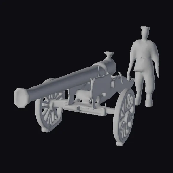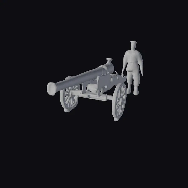In a detailed and realistic depiction, a soldier from World War I stands beside a field gun, showcasing the military’s might during that era. The soldier wears a green uniform with a cap, black boots, and a belt around his waist, holding a tool for the gun. The field gun itself features a long, olive-green barrel with a distinctive shape at its rear, mounted on a brown wooden carriage with large spoked wheels. The model captures the essence of early 20th-century warfare with high fidelity. The level of detail, from the texture of the soldier’s uniform to the intricate parts of the gun, makes this model perfect for historical animations, games, or educational projects. The realistic style and attention to detail offer a glimpse into the past, making it an excellent choice for projects aiming to depict historical accuracy.