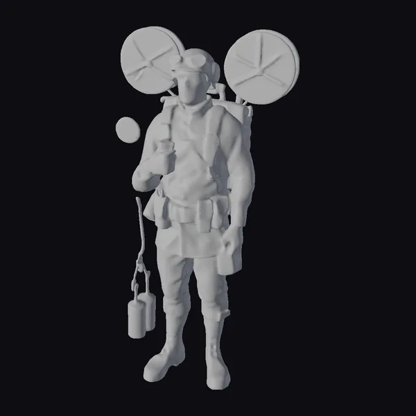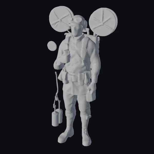 Detailed down to the stitching on his uniform and the metallic sheen of the propellers, this WWI soldier model is a marvel of historical recreation. The experimental flight pack, complete with spinning propellers and attached bombs, showcases the imaginative technological advancements of the era. His goggles and helmet add a touch of authenticity to the overall design. This model is perfect for projects requiring a blend of history and speculative technology, such as animations, games, or historical documentaries. The high level of detail, from the texture of the uniform to the mechanical intricacies of the flight pack, ensures that the model can be used in a variety of contexts, from educational to entertainment.