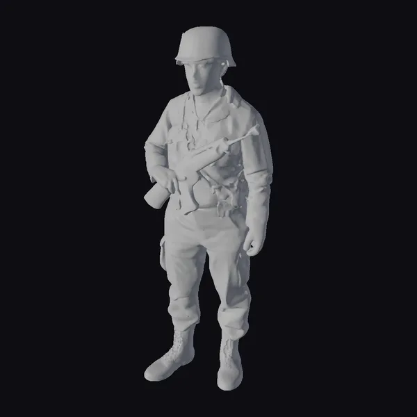 In a powerful stance, the soldier’s olive green uniform and helmet are meticulously detailed, with visible wear and tear that tells a story of rugged service. His rifle, held with a firm grip, adds to the sense of readiness and vigilance. The model’s realistic features, from the texture of the uniform to the determined look on his face, make it an excellent choice for projects requiring historical accuracy and emotional depth. Ideal for use in films, games, and historical reconstructions, this model brings a touch of authenticity to any scene.