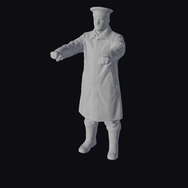 Detailed down to the last seam, this WWII Royal Navy gunner’s uniform is a marvel of realistic design. The long, dark oilskin coat falls just below the knees, complemented by a sturdy navy cap and knee-high boots. The pose, with fists clenched, suggests readiness for action. Textures and lighting enhance the lifelike appearance, making this model perfect for historical animations, games, or educational projects. Its commercial license allows for wide use, from professional designs to personal projects.