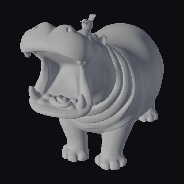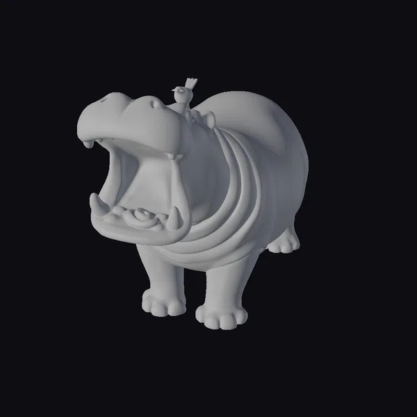 In a comical stance, a hippopotamus stands with its mouth agape, showcasing its sharp teeth and pink interior. A small bird sits atop its head, adding to the scene’s humor and charm. The model’s stylized features and vibrant colors bring a lighthearted atmosphere to any setting. Its applications are endless, from animation and games to 3D printing and design. The detailed textures and realistic proportions make it an excellent choice for projects requiring a mix of realism and playfulness.