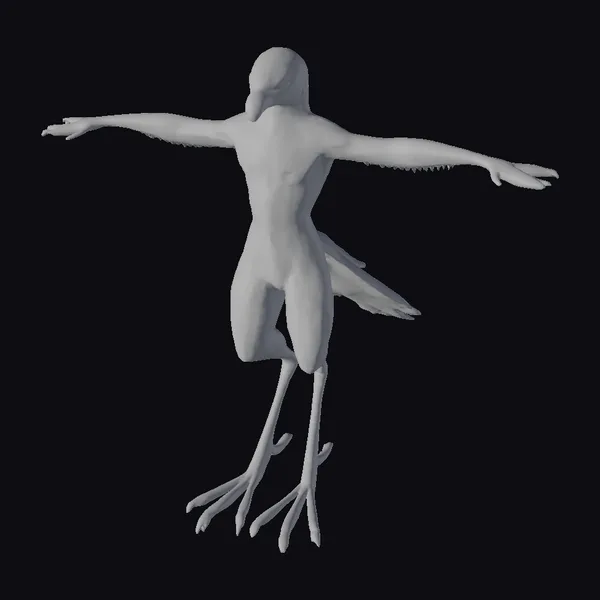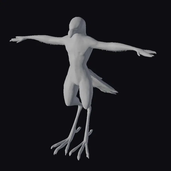 Perched on one leg with the other leg lifted, this yellow bird humanoid exudes a sense of balance and poise. Its arms, outstretched to the sides, are tipped with sharp talons, while its beak points forward with a keen gaze. The model’s feathers are meticulously detailed, with a smooth transition from bright yellow to creamy white on its chest and thighs. The texture of its skin and feathers appears lifelike, inviting the viewer to explore the intricate details. This 3D model would be perfect for animations, games, or virtual reality experiences that require a mythical or fantasy element. Its unique blend of bird and human features makes it an excellent choice for designers seeking to add a touch of magic to their projects.