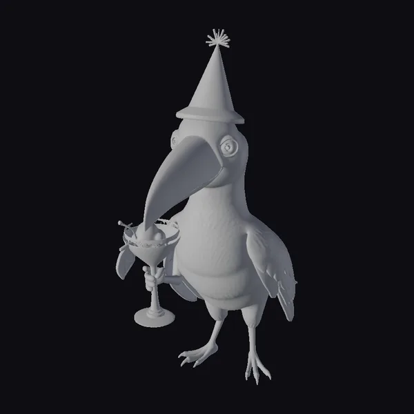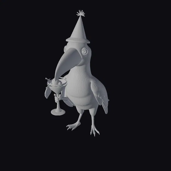 Perched in a lively stance, this cheerful yellow bird is the epitome of celebration. Its body is adorned with a vibrant party hat, complete with colorful stripes and a star on top. The bird’s large, expressive eyes sparkle with excitement as it holds a cocktail glass filled with a yellow drink and garnished with a straw and umbrella. The bird’s bright orange beak and feet add a pop of color against its sunny yellow feathers, which gradually transition to green on its wings. This model is perfect for adding a touch of whimsy to games, animations, or 3D designs. Its playful nature makes it ideal for projects requiring a lighthearted, humorous element.