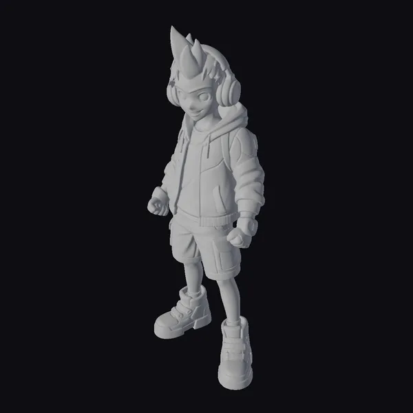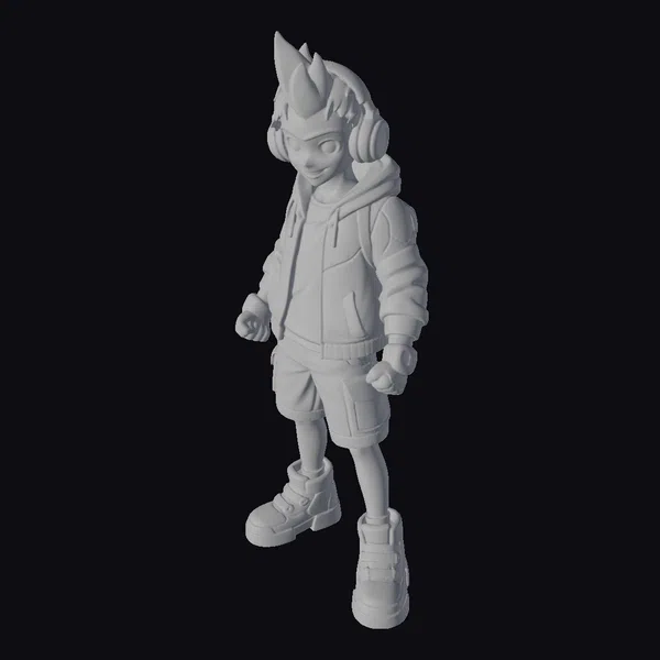 This vibrant cartoon character stands tall, clad in a striking yellow and black ensemble. The outfit consists of a zip-up jacket adorned with lightning bolts, paired with dark gray shorts and matching sneakers. A pair of headphones, complete with a distinctive yellow fin on top, adds a cool, edgy touch. The character’s red eyes gleam with determination, set against a backdrop of a confident, slightly off-balance pose. The model’s intricate details, from the texture of the clothing to the expression on the character’s face, make it perfect for use in animations, games, or virtual reality experiences.