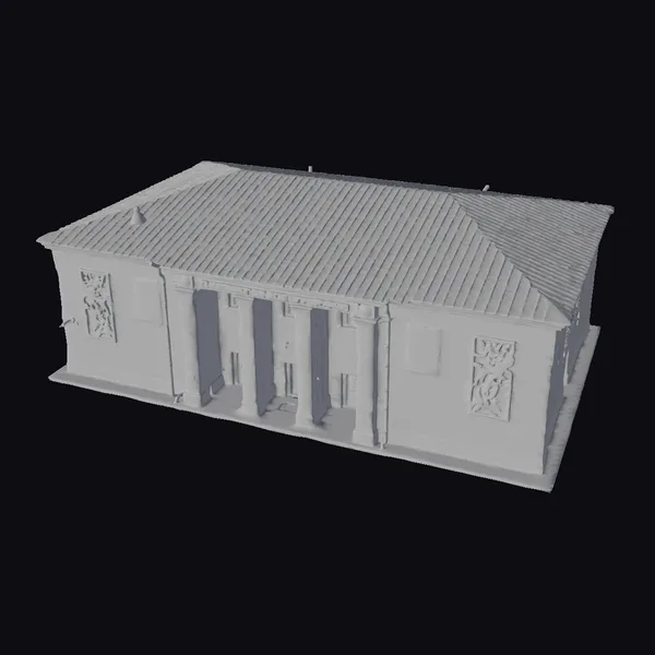 Positioned at a dynamic angle, the yellow building’s facade comes alive with a gray roof that appears almost lifelike in its texture. Four white columns stand proudly at the front, supporting the structure with classic elegance. The base of the building is adorned with vibrant green grass, adding a touch of natural beauty. The walls are punctuated by several windows, each framed with precision. This model is perfect for projects requiring a realistic architectural element, suitable for use in games, 3D printing, VR/AR experiences, animation, and design applications.