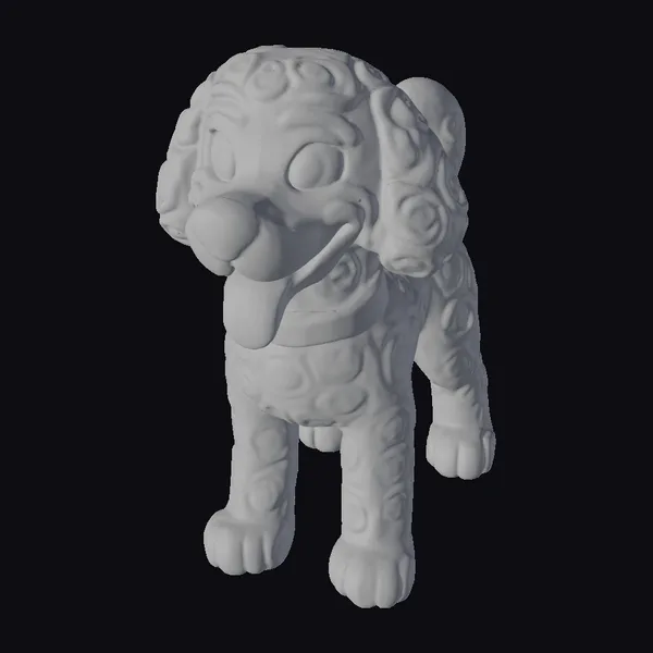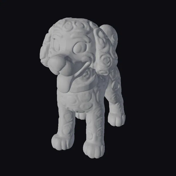 Rendered in vibrant yellow hues, this cartoon dog boasts curly fur adorned with swirling patterns, adding a whimsical touch. Its large, expressive eyes and wide, cheerful grin contribute to its playful demeanor. The dog’s tongue sticks out, lolling in a carefree manner, while a purple collar encircles its neck, adding a pop of color. Standing on all fours, the dog’s pose exudes readiness for action. This model is perfect for animations, games, or any project requiring a friendly canine character. Its stylized features make it versatile for various creative applications.