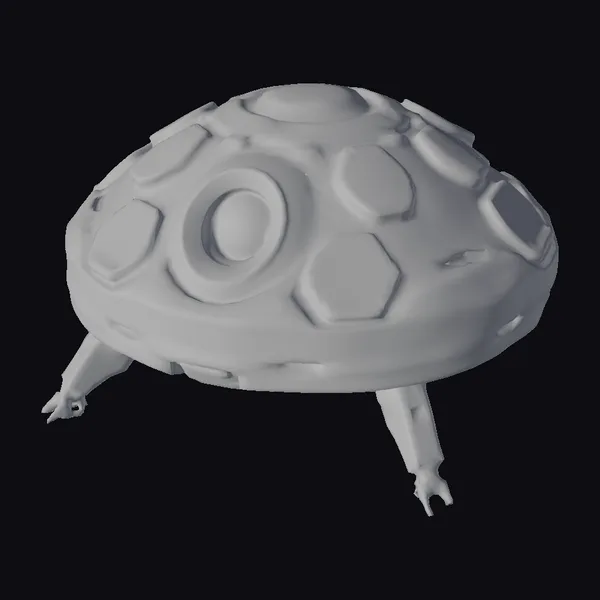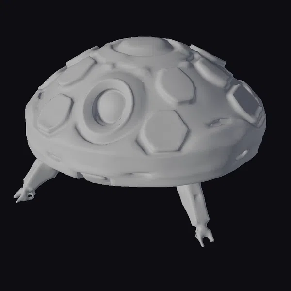 Perched atop three sturdy legs, this yellow dome robot head presents a striking appearance. The surface is adorned with hexagonal panels in a darker metallic hue, interspersed with areas of rust and wear. A prominent orange-rimmed eye glows softly, giving the impression of a vigilant sentinel. The dome’s texture is a mix of smooth and rugged metallic surfaces, suggesting extensive use. The head’s design implies a blend of functionality and futuristic aesthetics, making it suitable for sci-fi environments, animations, or game designs. Its robust appearance hints at durability and resilience in harsh conditions.