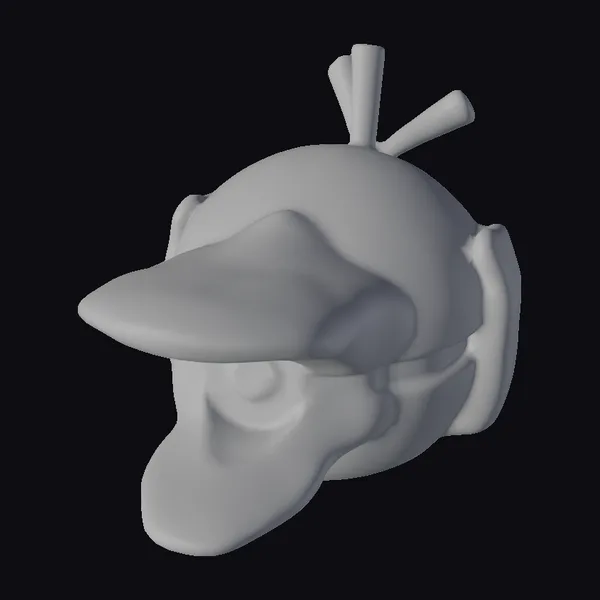 Perched on a simple base, the duck’s head is tilted slightly to one side, giving it a lively, dynamic appearance. The goggles add a touch of whimsy, while the smooth, rounded texture of the duck’s head and beak invite the eye to linger. The model’s proportions are exaggerated, with a large head and small features, lending to its cartoonish charm. The lighting is soft and even, highlighting the model’s vibrant yellow color. This model would be perfect for use in animations, games, or as a decorative element in a 3D environment. Its playful nature makes it an excellent choice for projects aimed at a younger audience or for adding a lighthearted touch to any design.