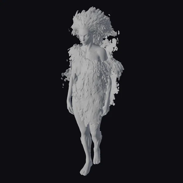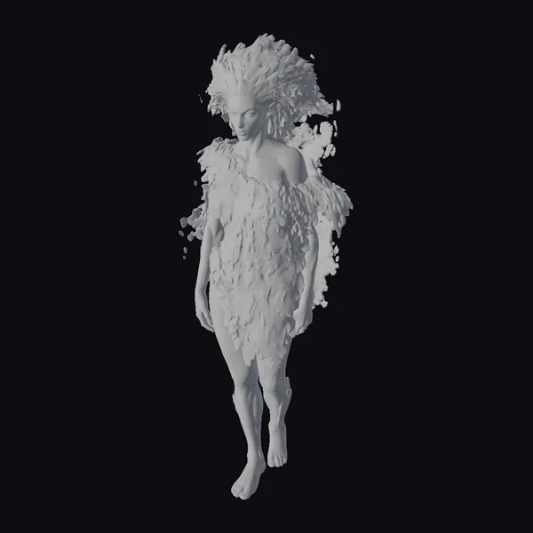 This stylized humanoid figure stands with a gentle, flowing posture, as if caught in a serene dance. The body and hair are a vibrant yellow, with an organic, petal-like texture that suggests a connection to nature. Small, detailed floral elements appear to burst from the skin, adding depth and a sense of movement. The figure’s facial features are subtle, with a soft, closed-mouth smile and downcast eyes, enhancing the tranquil mood. The overall effect is one of dreamy, ethereal beauty, perfect for projects requiring a touch of fantasy and surrealism. Ideal for use in animation, games, VR/AR experiences, and artistic designs where a unique, captivating character is needed.