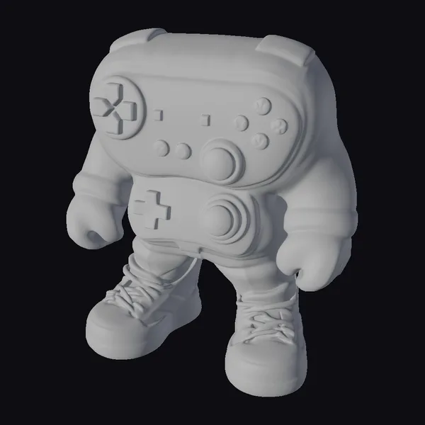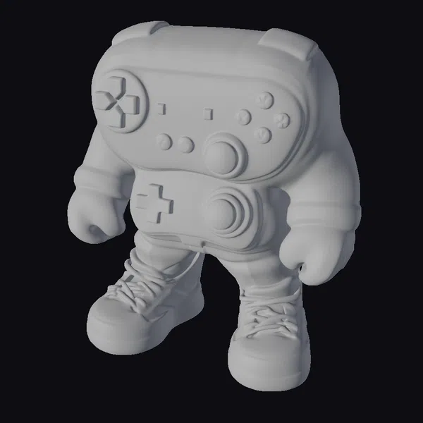 Standing proudly with its white sneakers firmly on the ground, this delightful yellow robot is a sight to behold. Its body is shaped like a gaming controller, complete with a directional pad on its left side and a set of buttons on its right, including a large central button and four smaller red buttons marked A, B, X, and Y. The robot’s ‘face’ is a white panel with a cross-shaped button on its chest, adding to its endearing appearance. The yellow and white color scheme, along with its shiny finish, gives it a fun and lively vibe. This model is perfect for use in animations, games, or as a decorative piece, especially in scenes aimed at a younger audience or those with a playful theme.