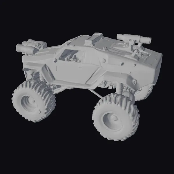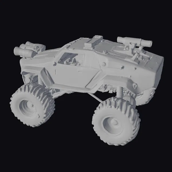Perched on massive, rugged tires, this yellow Mars exploration vehicle exudes an aura of unstoppable force. The vehicle’s body is a mesh of sharp, angular lines and flat surfaces, giving it a distinctly futuristic look. Two substantial guns are mounted on top, suggesting its dual role in both exploration and defense. The thick, black tires are accentuated with yellow detailing, adding a pop of color and highlighting the vehicle’s readiness for the harsh Martian environment. The vehicle’s design hints at its use in games, simulations, or animations where a rugged, sci-fi off-road vehicle is needed. Its robust build and armored look make it perfect for scenes requiring a vehicle that can withstand extreme conditions.
