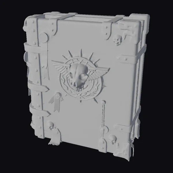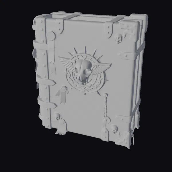 The Codice Amarelo box stands out with its bright yellow metallic surface, embellished with a striking winged skull emblem at its center. The box is surrounded by a pattern of ancient symbols and adorned with metallic rivets and leather straps, adding to its rugged, industrial aesthetic. The lid is secured with metallic clasps, suggesting a treasure or artifact of great importance. The overall design exudes a sense of sci-fi mystique, perfect for projects requiring a touch of futuristic mystery. Ideal for use in games, 3D printing, VR/AR experiences, animations, or designs that demand a unique, eye-catching prop.