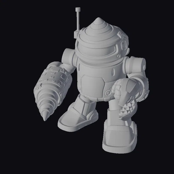 Positioned dynamically, the mining robot showcases its impressive design. The yellow and gray metallic body is complemented by a conical top and a large, cylindrical drill mounted on its arm. A glowing yellow light on its front panel adds a touch of realism. The robot’s pose suggests it’s about to spring into action, making it perfect for scenes requiring industrial or sci-fi elements. Its detailed appearance makes it suitable for various applications, including games, 3D printing, VR/AR experiences, animation, and design projects.