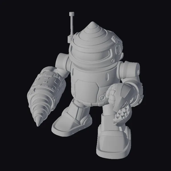 Gazing forward with a glowing yellow eye, a sturdy mining robot stands ready, its arm-mounted drill at the ready. The robot’s body is a mix of yellow and gray metallic surfaces, with a distinctive conical top and a robust stance.