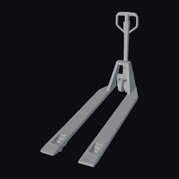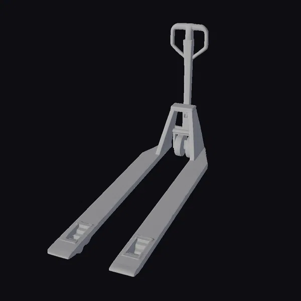Positioned dynamically, the yellow pallet jack showcases its robust metal handle and forks, complete with detailed textures and a realistic red wheel. The model highlights the equipment’s industrial aesthetic, with a focus on its operational readiness. Ideal for use in 3D rendering projects, animations, or architectural visualizations, this model adds an authentic touch to warehouse or industrial scenes. Its detailed design allows for versatile applications in game development, virtual reality experiences, or as a precise design reference.
