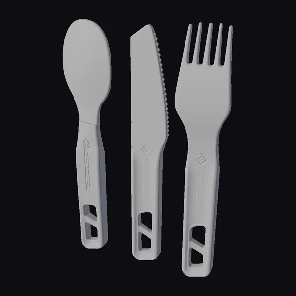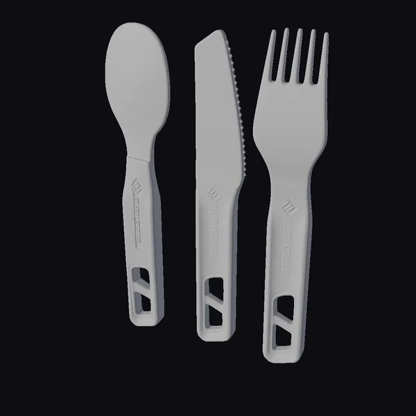 Rendered in vibrant yellow, this set of plastic utensils exudes a cheerful vibe. The spoon’s smooth, rounded bowl connects to a sturdy handle with a distinctive cut-out section near the bottom. The knife features a serrated blade, perfect for cutting through various foods with ease, while its handle matches the spoon’s design for a cohesive look. The fork, with its four tines, is built for spearing and holding food securely. Each piece is detailed with a small logo and text on the handle, adding a touch of realism. These utensils are perfect for 3D rendering in games, animations, or architectural visualizations, especially in scenarios requiring modern kitchen settings or eco-friendly product showcases. They can also be used in VR/AR applications for a more immersive dining experience.