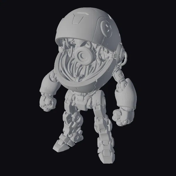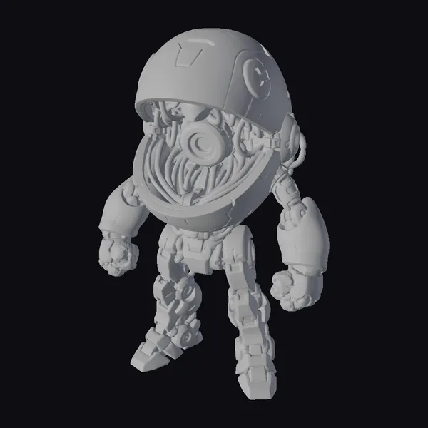 This stylized robot character boasts a bright yellow body with a large, dome-shaped head that opens to reveal a black interior and a glowing red eye. The robot’s arms are a striking red, adding a splash of color to its mechanical limbs. A blue triangle on its forehead adds a touch of mystery to its appearance. With its playful stance and futuristic design, this robot is ideal for use in animations, games, or as a unique decorative element. Its stylized features ensure it stands out in any scene, making it a great addition to sci-fi or cartoon-style projects.