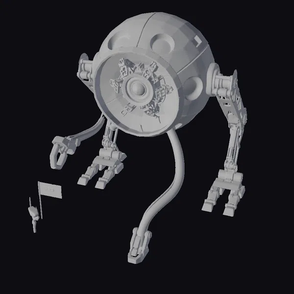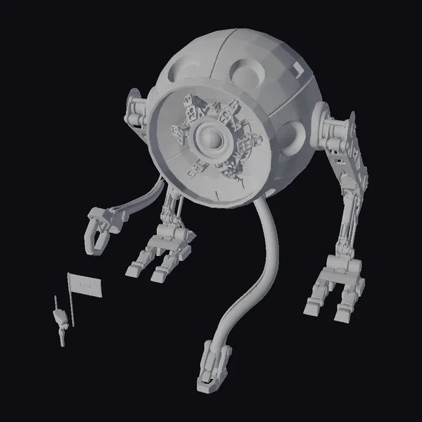 Positioned dynamically, the robot’s spherical body is adorned with three circular openings at the top, giving it a distinctive, high-tech appearance. Its four mechanical legs are equipped with yellow and gray metallic feet, suggesting stability and mobility. The large, round eye at the front showcases a complex inner mechanism with a central lens, surrounded by a rainbow of colors that hint at advanced sensory capabilities. A small flag and tool are detached, implying a readiness for exploration. This model excels in applications requiring a futuristic, mechanized look, such as in games, 3D printing, VR/AR experiences, animations, and design projects. Its detailed texture and lighting make it a premium addition to any sci-fi themed project.