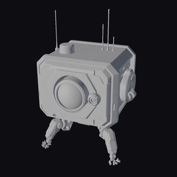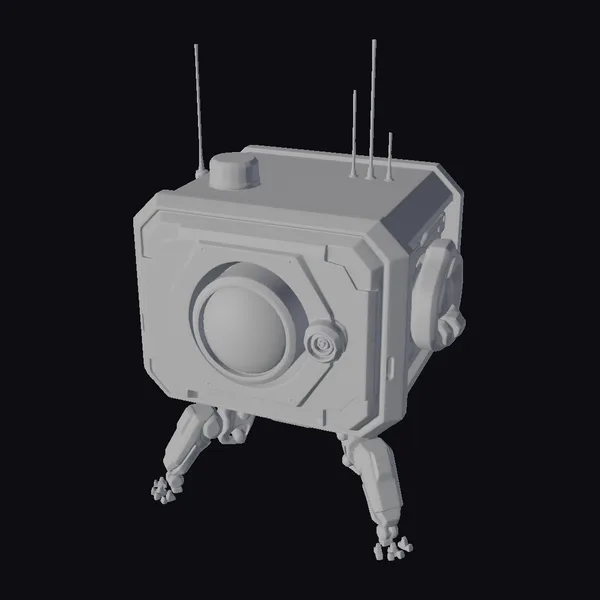 Perched on three sturdy legs, this yellow robot exudes a sense of mechanical vigilance, its large central eye gleaming with an inner light. The body, a blocky cube with beveled edges, showcases a distressed metallic finish, with black streaks and splotches suggesting a history of rugged use. Three thin antennae rise from the top, angled as if actively scanning the surroundings. A smaller circular component on the side adds to the robot’s utilitarian appearance, suggesting advanced functionality. This model is perfect for projects requiring a blend of sci-fi flair and industrial grit, suitable for use in games, 3D printing, VR/AR experiences, animations, or architectural designs that demand a futuristic edge.
