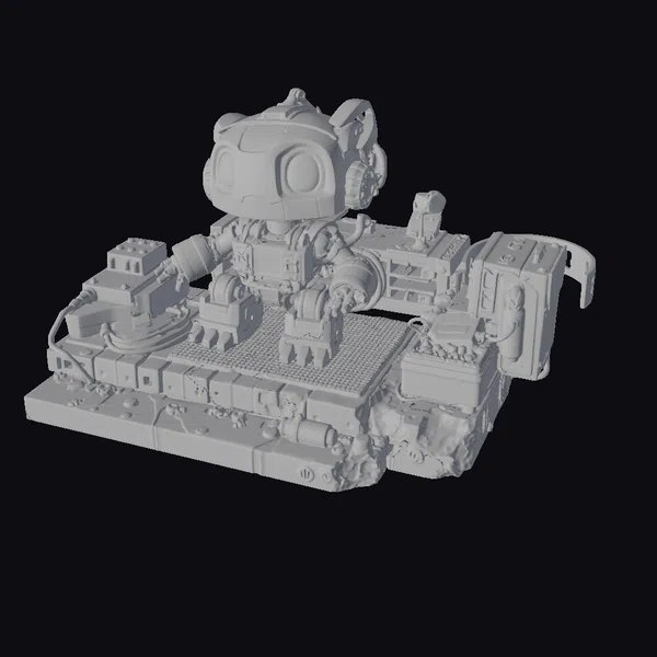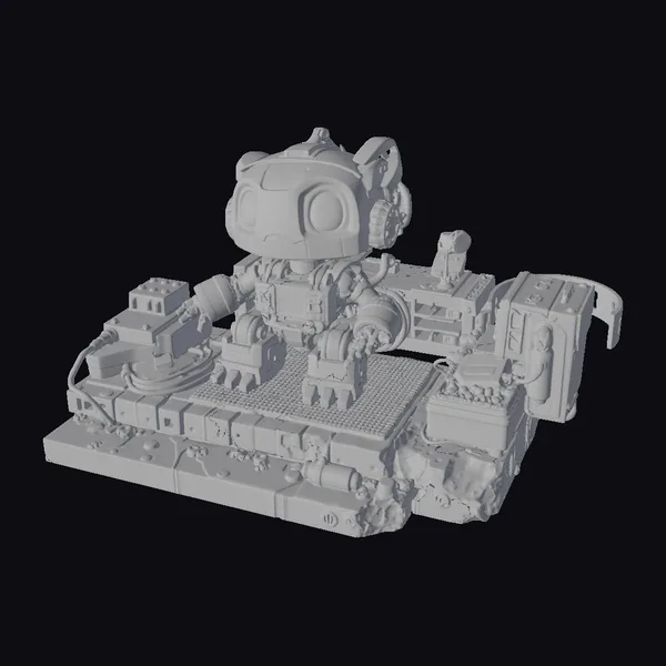 Positioned dynamically on a worn workstation, the robot’s yellow and metallic body gleams with a sense of readiness. Its large, bright blue eyes sparkle with curiosity as it sits amidst an array of industrial tools and machinery. The workstation, with its rusty textures and detailed bolts, tells a story of hard work and dedication. This model is perfect for enhancing scenes in games, animations, or virtual reality projects that require a touch of scifi whimsy. The intricate details, from the robot’s mechanical limbs to the scattered tools, ensure a high level of realism and immersion.
