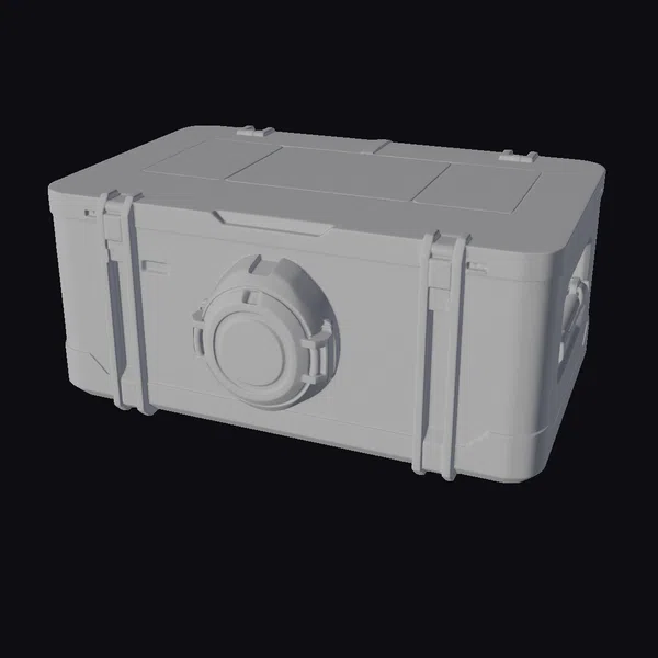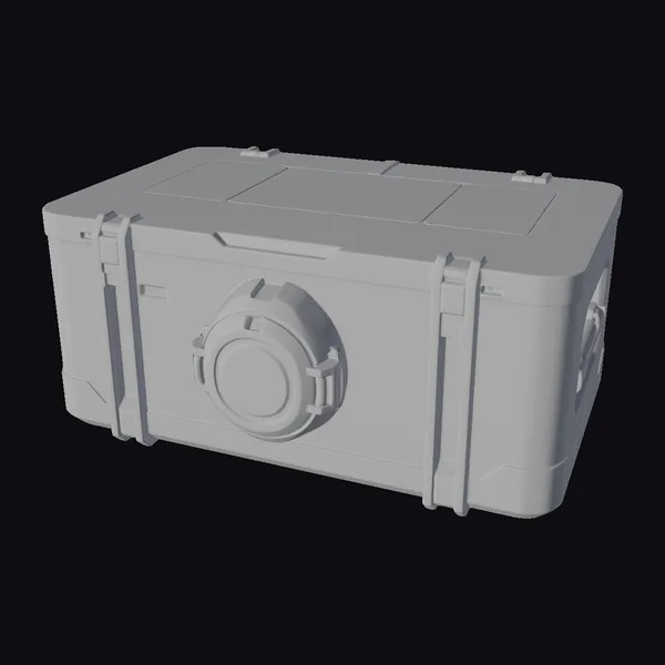 Positioned at a dynamic angle, the containment box showcases its worn, yellow exterior with black splatter marks, suggesting a history of heavy use in a demanding environment. The box features a prominent black circle with a glowing white ring on the front, flanked by sturdy black clasps. A large black panel on top adds to its utilitarian appearance. The box’s design hints at its use in securing and transporting high-tech or hazardous materials. Ideal for enhancing sci-fi environments, games, or animations with a touch of industrial realism.