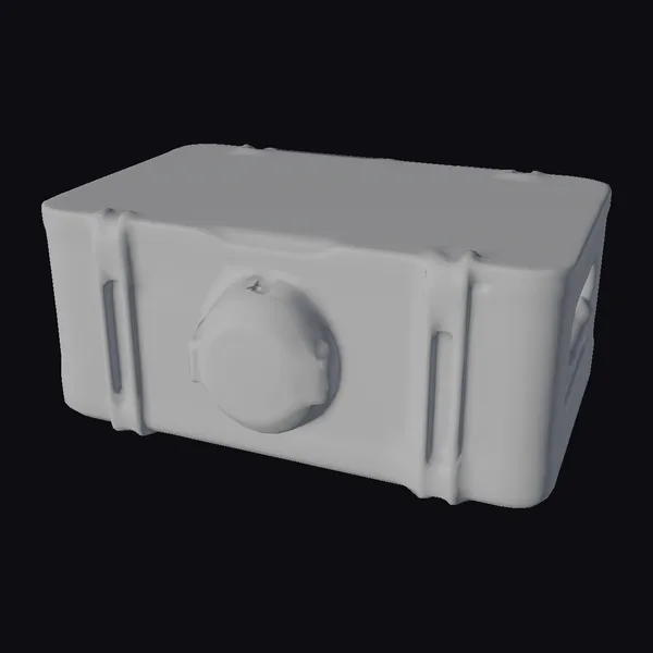 The containment box sits in a dynamic pose, showcasing its weathered, yellow exterior with black speckles and scratches, indicating a history of heavy use. The box features a large, black circle on the front with a glowing white outline, suggesting advanced technology. Two black straps on either side add to its industrial look. The top surface is flat and black, possibly a screen or panel. This model excels in games, print projects, VR/AR experiences, and animations where a futuristic, mysterious device is needed. Its detailed textures and unique design make it a compelling addition to any sci-fi scene.