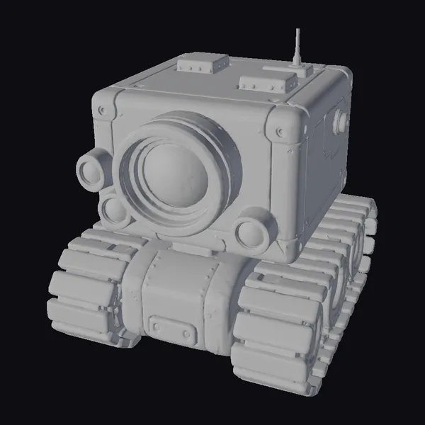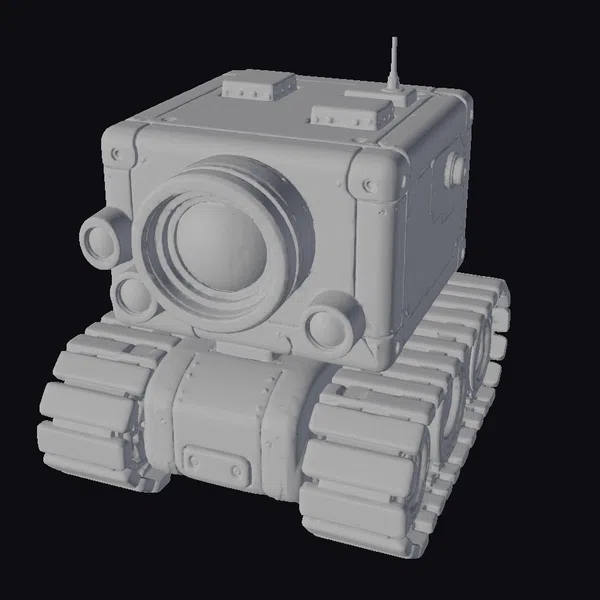 Detailed with precision, the yellow robot boasts a large central camera lens surrounded by smaller ones, giving it a multifaceted view. Its body, adorned with a weathered yellow and black finish, sits atop durable black tracks, suggesting mobility and resilience. The antenna on top hints at advanced communication capabilities. Ideal for projects requiring a futuristic, high-tech feel, such as game environments, sci-fi animations, or virtual reality experiences.