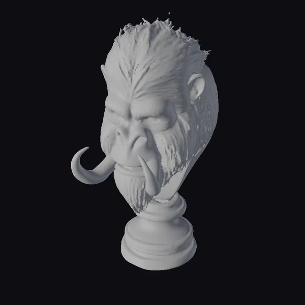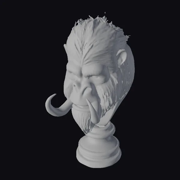 This imposing yeti bust is captured in a detailed, realistic rendering, showcasing its formidable presence. The creature’s head is covered in thick, brown fur with a distinctive texture that simulates the look of coarse hair. Its face is a deep gray, with a pronounced snout and sharp, white tusks that curve downwards, giving it a menacing appearance. The eyes seem to hold a fierce inner light, as if the creature is about to roar. Positioned on a classic white pedestal, the bust is elevated, emphasizing its dominance. The pedestal’s simple, rounded design contrasts with the complexity of the yeti’s features, drawing focus to the creature’s raw power. This model is perfect for use in games, animation projects, or as a striking piece of digital art. Its high level of detail makes it suitable for close-up shots or as a central element in a fantasy scene.