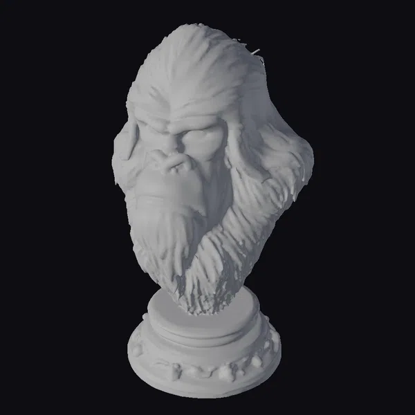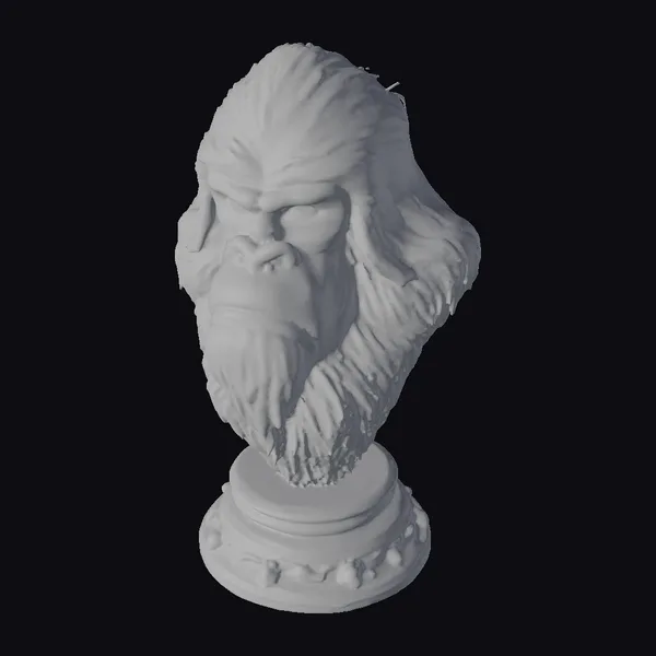 Positioned on a sturdy pedestal adorned with a gold and dark stone base, the yeti bust is a marvel of detailed craftsmanship. Its fur, rendered in shades of gray, appears both wild and majestic, framing a face that exudes a mix of power and introspection. The eyes, with their deep-set gaze, seem to hold ancient wisdom, while the fur’s texture suggests the harsh, untamed beauty of the natural world. This model is perfect for those looking to add a touch of mythical intrigue to their projects, whether in gaming, animation, or design. Its high level of detail makes it suitable for close-up shots and animations, allowing for a deep exploration of its intricate features.