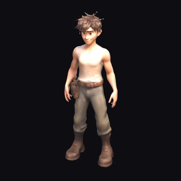 This young adventurer boy is depicted in a dynamic A-Pose, with his arms outstretched and a confident expression on his face. His brown hair is styled in a messy, tousled look, and his brown boots and belt add a rugged touch to his outfit. The digitally painted figure boasts a Pixar-inspired style, with smooth textures and a vibrant color palette. The model’s proportions are well-balanced, with a strong emphasis on the character’s youthful energy. This model is perfect for use in games, animation, and design projects, where a strong and powerful young character is needed.