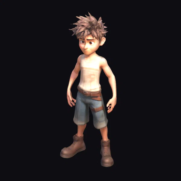 This young adventurer boy 3D model is meticulously crafted with a focus on detail and realism, inspired by the iconic style of Pixar. He stands in a dynamic A-Pose, with his arms outstretched and a look of determination on his face. His brown hair is tousled and unkempt, adding to his rugged charm. The model features a white shirt, blue jean shorts with brown knee pads, and sturdy brown boots, perfect for any adventure. The textures and lighting are carefully designed to give the model a lifelike appearance, making it suitable for various applications such as games, animation, and 3D printing. The model’s proportions and anatomy are well-defined, with a strong emphasis on the face and hands, giving it a premium look and feel.