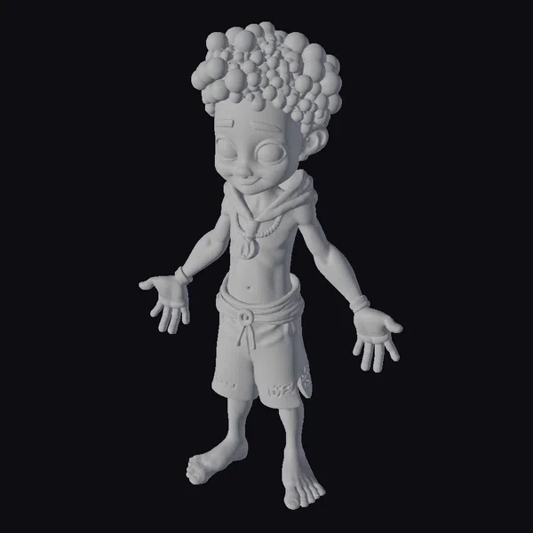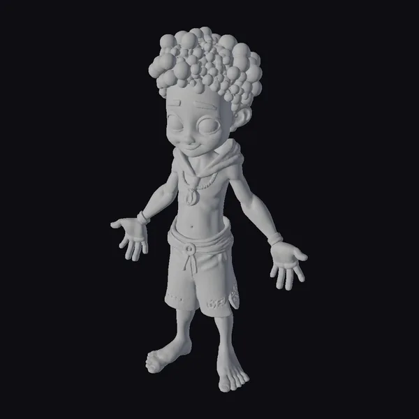 Standing with an inviting posture, this character’s curly dark hair and expressive brown eyes are immediately captivating. The orange hoodie and shorts combination, complete with blue patterns and a brown belt with a gold buckle, showcases a unique african-inspired design. The character’s bare feet, secured with tan sandals, and the golden bracelets on its wrists add a touch of earthiness to its overall appearance. This model is perfect for projects requiring a friendly, youthful character, such as animations, games, or virtual reality experiences, where a relatable and approachable avatar is needed.