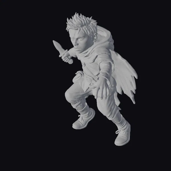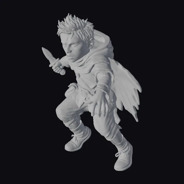Deep in a fantasy realm, a young blond rogue prepares for battle, his eyes fixed intently on the horizon. This 3D model showcases the character in a dynamic pose, with his right hand grasping a dagger and his left hand extended for balance. The stylized design features a brown cloak flowing behind him, complemented by a matching outfit and boots. The model’s textures and lighting create a vivid, lifelike appearance, making it perfect for games, animation, or design projects. Its detailed features and proportions ensure a high-quality visual experience.