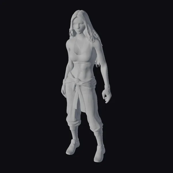 Standing confidently with her feet shoulder-width apart, this young female fighter exudes a sense of readiness and strength. Her athletic physique is accentuated by a gray sports bra and black fingerless gloves, while a colorful sash adds a pop of personality to her outfit. The intricate details of her wavy dark brown hair and tan skin texture bring a sense of realism to this 3D model. Perfect for use in games, animations, or 3D printing projects, this character model is sure to make a statement. Her versatile appearance allows her to fit seamlessly into various environments, from martial arts studios to fantastical realms.