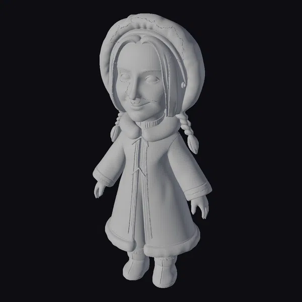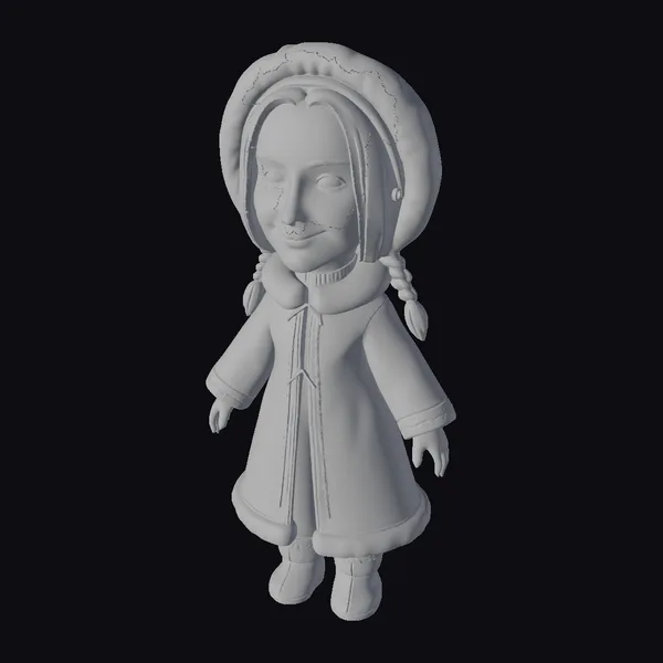 This stylized character model depicts a young girl dressed in a bright red winter parka adorned with white fur trim and intricate blue and red patterns. Her dark hair is styled in two braids, and she sports a matching fur-trimmed hat. The girl’s attire is completed with brown boots, and her facial expression is warm and inviting. She stands in a neutral pose, making her versatile for various applications. This model is ideal for projects requiring a stylized, cartoonish character, such as animations, games, or virtual environments. The detailed textures and vibrant colors bring her to life, making her a great addition to any creative project.