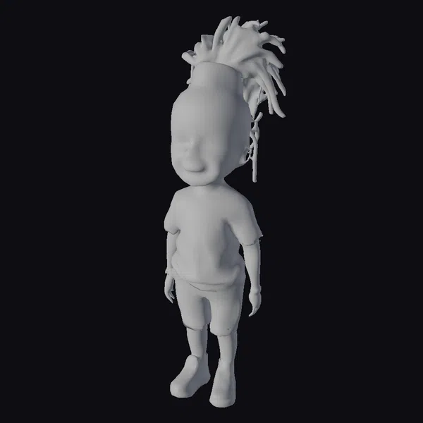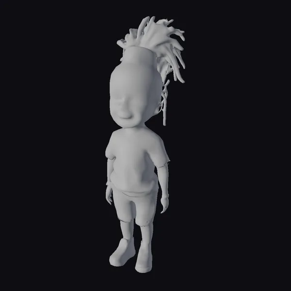 Standing confidently with her dreadlocks styled in a high ponytail adorned with green, red, and orange bands, this stylized model of a young African girl showcases a bright smile and expressive brown eyes. Her casual outfit consists of a plain white t-shirt, light blue denim shorts, and white sneakers with pink and green accents. The model’s proportions are well-balanced, with detailed textures that highlight her joyful expression and lively appearance. The simplicity of her attire makes her dreadlocks and accessories the focal point, perfect for projects focusing on character design, animation, or educational content. Her cartoonish style ensures broad appeal across various creative projects.