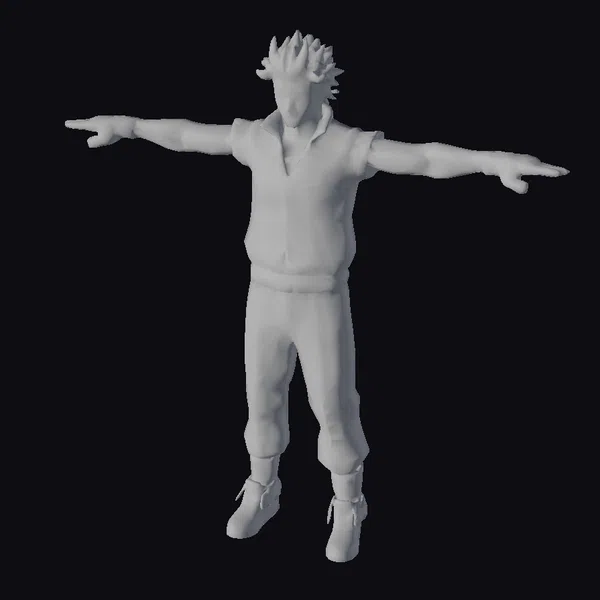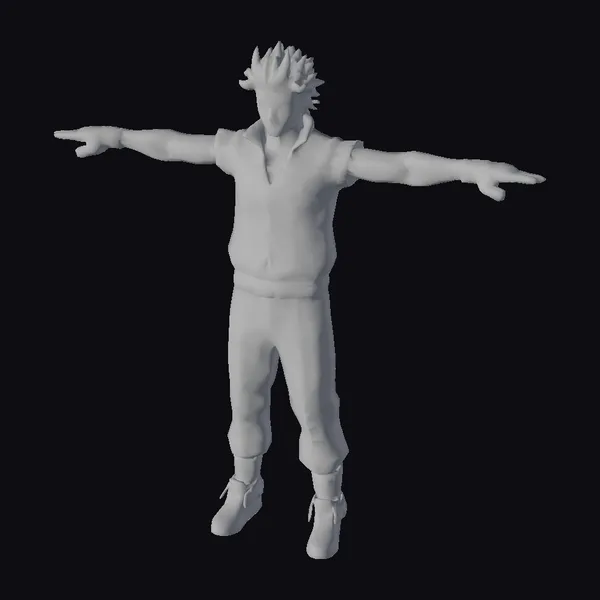 This highly detailed 3D model captures the essence of a young Japanese male athlete. His T-pose showcases his lean physique, accentuated by a green jacket with a partially unzipped front, revealing a hint of his chest. The model’s black hair is styled in a spiky, textured look, while his green eyes seem to gleam with intensity. He wears gray pants that are slightly cuffed at the bottom, paired with silver sneakers that add a touch of modernity to his overall appearance. The model’s facial features are finely tuned, with high cheekbones and a determined expression. The level of detail in this model makes it suitable for various applications, including games, animation, virtual reality, and 3D printing.
