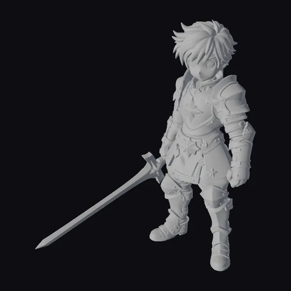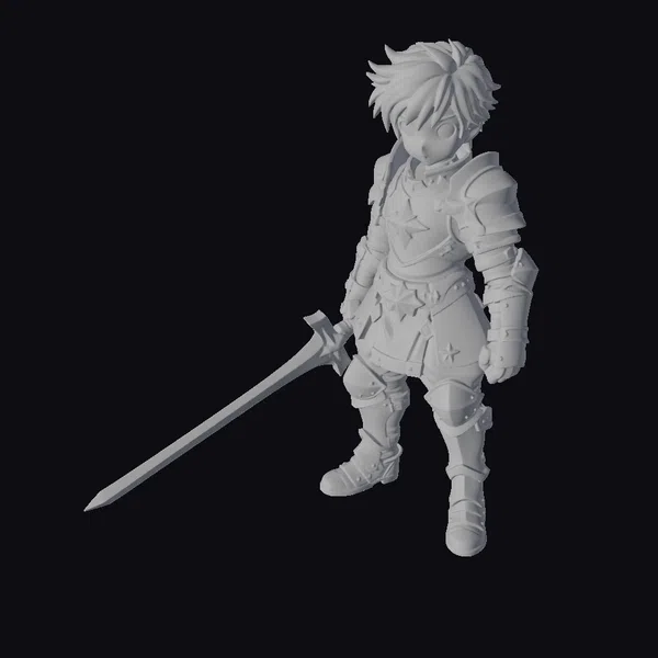 Standing tall with a determined stance, this stylized young warrior showcases intricate details on his armor, from the golden accents to the silver plating. His short, spiky brown hair frames a resolute face, highlighted by striking blue eyes. The long sword in his hand, with its gold hilt and silver blade, seems an extension of his courageous spirit. This model is perfect for projects requiring a heroic character, suitable for animation, game development, 3D printing, or virtual reality experiences.