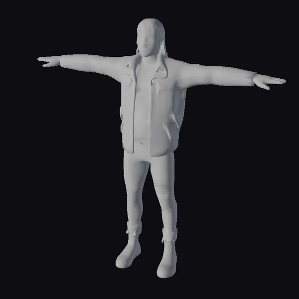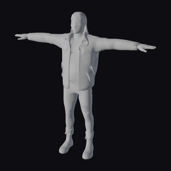 Standing with arms outstretched, this game-ready 3D avatar of a 24-year-old male musician exudes a confident, urban vibe. His black leather jacket is zipped up, revealing a graphic tee underneath, while his ripped black jeans and black boots complete his streetwear look. The character’s dark hair is styled in a way that adds to his edgy appearance. The detailed textures and realistic proportions make this model suitable for various applications, including games, 3D printing, VR/AR experiences, animation, and design projects. The model’s pose and facial features convey a sense of youthful energy and musical passion.