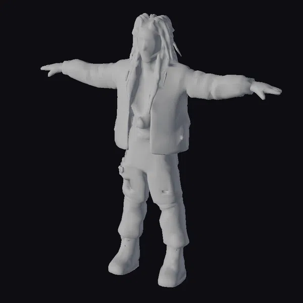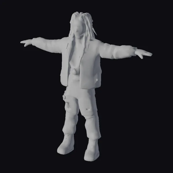 Standing with arms outstretched, this game-ready 3D avatar of a 24-year-old male musician captures the essence of urban street style. His dark dreadlocks are meticulously detailed, framing his face with a carefree attitude. He wears a vibrant orange graphic tee under a rugged black leather jacket, which is complemented by black ripped pants and sturdy boots. The model’s pose and detailed textures make it an ideal choice for various applications, including game development, 3D printing, virtual reality (VR) and augmented reality (AR) experiences, animations, and design projects. The high level of detail in the textures, such as the wear and tear on the clothing and the realistic facial features, enhances the model’s realism.