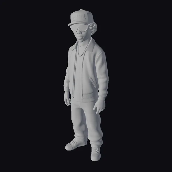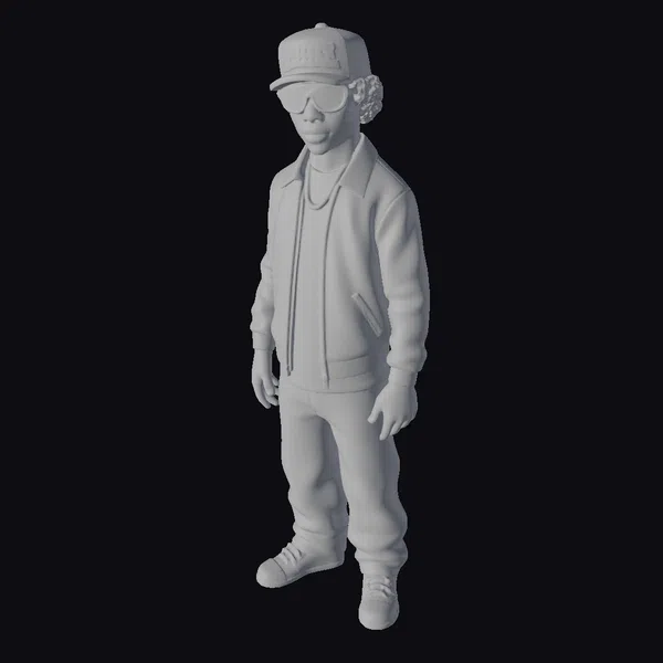 This 3D model captures the essence of urban streetwear with a young man posed in a relaxed stance. He wears a black leather jacket with a white shirt underneath, paired with blue jeans and white sneakers. A black hat with ‘Compton’ emblazoned on it and dark sunglasses complete his casual look. The gold chain around his neck adds a hint of glamour. The model’s stylized features and detailed textures make him suitable for various applications, including games, animation, and design projects. His versatile outfit and confident demeanor make him an excellent choice for projects aiming to capture a modern, urban aesthetic.