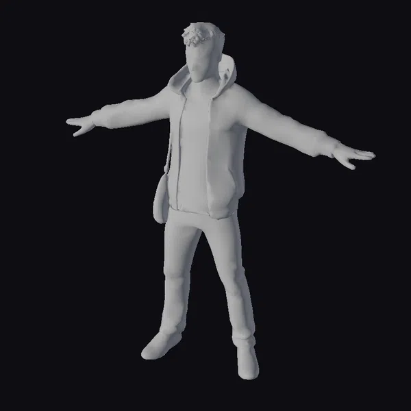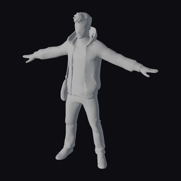 Standing with his arms outstretched, this young man exudes a sense of openness and approachability. His short, dark brown hair is tousled, and his slight stubble beard adds a rugged touch to his features. He wears a gray hoodie over a white t-shirt, paired with distressed jeans and silver sneakers, capturing a relaxed, youthful vibe. The model’s athletic build is subtly defined, suggesting a fit and active lifestyle. The realistic texture and lighting enhance his lifelike appearance, making him suitable for various applications, including games, animation, virtual reality, and design projects.