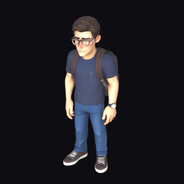 Standing confidently with a slight slouch, this cartoon-style young man is posed with his arms relaxed by his sides. His facial features are soft and approachable, with a subtle expression that invites engagement. The brown backpack adds a practical touch, suggesting he’s on his way to or from an exciting journey. His outfit is detailed with a blue t-shirt featuring a pocket, blue jeans, and brown sneakers with white laces. The glasses and watch add a layer of personality to his appearance. This model is perfect for animations, games, or any project requiring a friendly, youthful character. Its stylized yet detailed design makes it versatile for various creative applications.