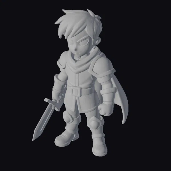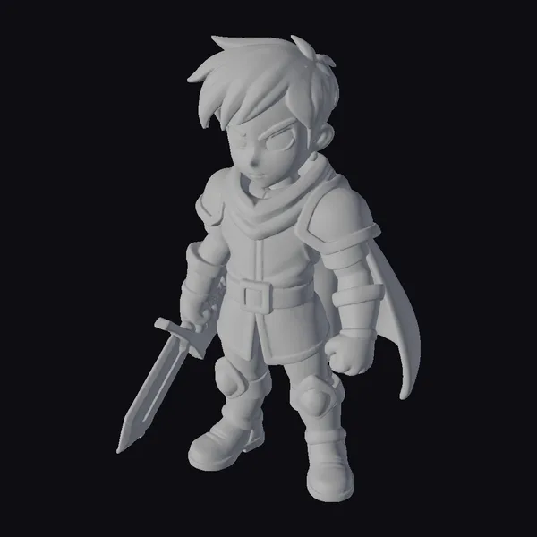 Standing confidently with his sword in hand, this young warrior exudes a sense of bravery and determination. His brown hair is styled in a spiky fashion, complementing his bright blue eyes that seem to pierce through any obstacle. The red and blue armor, adorned with gold accents, shines with a sense of valor, while the flowing blue cape adds a dynamic touch to his stance. The model’s cartoonish style makes it perfect for projects requiring a more stylized, animated look, such as games, animations, or even print materials. Its detailed textures and pose make it versatile for various creative applications.