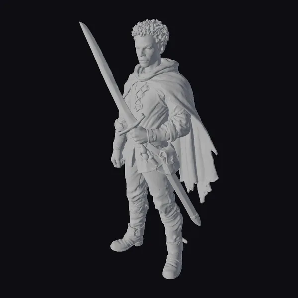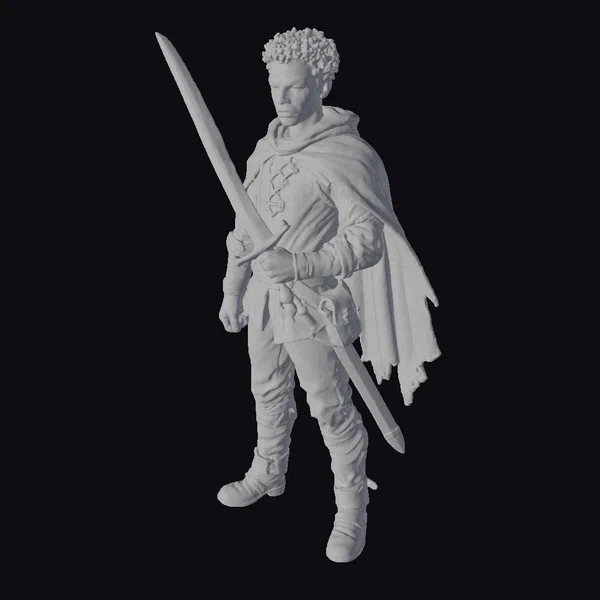 Standing tall with a strong, focused stance, this young warrior exudes a sense of readiness and determination. His short, curly hair is a stark contrast to the sharp, metallic sheen of the longsword he holds, its blade pointed upwards. The warrior’s attire is a blend of earthy tones, with a cream-colored tunic adorned with brown braids, complemented by leather armor on his arms and boots. A brown leather belt around his waist holds a scabbard for his sword, while a flowing beige cape drapes over his shoulders, billowing slightly behind him. The model’s detailed textures, from the stitching on his clothing to the leather straps of his armor, invite a closer look. Ideal for use in games, 3D printing, VR/AR experiences, animation, and design projects, this model brings a touch of medieval heroism to any scene.