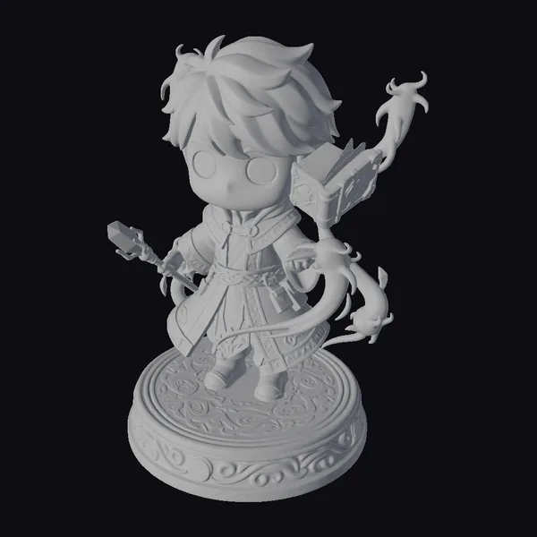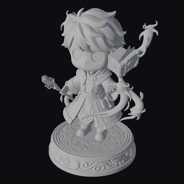 This stylized figurine captures the essence of a young wizard in a dynamic pose, showcasing intricate details such as the glowing blue staff, the ornate brown book with blue gems on his shoulder, and the swirling magical effects around him. The chibi-style character design, with its large eyes and small body, adds a touch of whimsy and charm. The figurine’s base, with its gold and brown design, complements the character’s purple and gold robe. Ideal for fans of fantasy and magic, this model is perfect for use in games, animations, or as a decorative piece. Its detailed textures and lighting make it suitable for high-quality 3D printing, virtual reality experiences, or architectural visualizations.