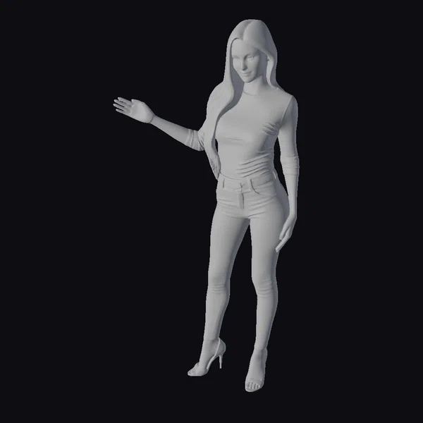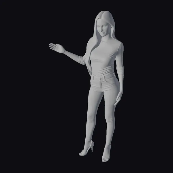 Gazing at this 3D model, your eyes are drawn to the young woman’s poised demeanor, her body angled slightly to one side as she extends one hand. Her long blonde hair flows smoothly down her back, complementing her bright expression and casual yet stylish outfit. The fitted jeans and white top accentuate her figure, while high heels add a touch of sophistication. The model’s realistic appearance makes her suitable for various applications, including game development, animation projects, virtual reality experiences, and architectural visualizations where human presence is needed. Her detailed features and lifelike textures ensure a seamless integration into any digital environment.